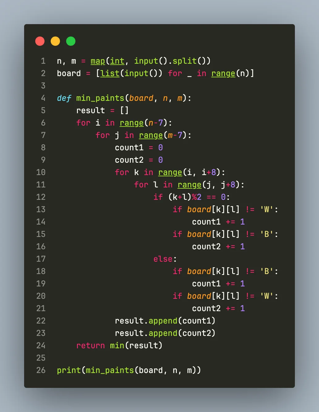 보드가 체스판처럼 칠해져 있다는 보장이 없어서, 지민이는 8×8 크기의 체스판으로 잘라낸 후에 몇 개의 정사각형을 다시 칠해야겠다고 생각했다. 당연히 8*8 크기는 아무데서나 골라도 된다. 지민이가 다시 칠해야 하는 정사각형의 최소 개수를 구하는 프로그램을 작성하시오.