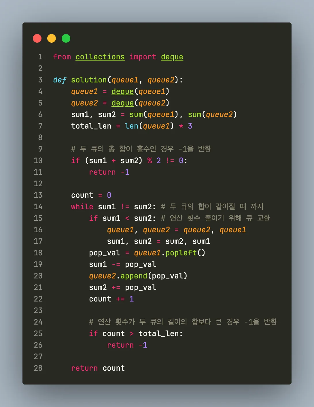 코드를 제출하면 96.7% 만 맞았다고 뜨길래, 다른 사람 풀이를 봤다. 연산 횟수가 두 큐의 길이의 합보다 크면 -1을 반환했어야 했다. 이 부분에서 막혔다.