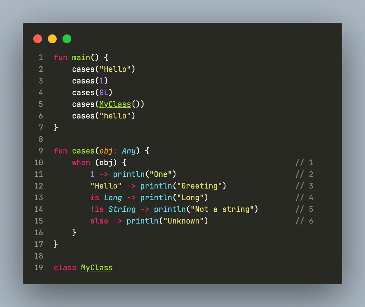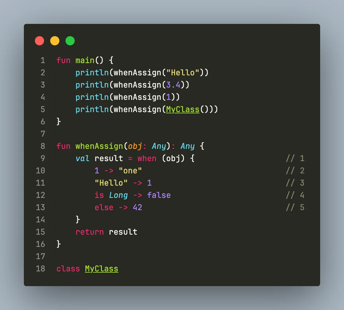 when 표현식(expression): when 표현식은 각 분기의 결과를 반환합니다. when 표현식의 값은 일치하는 분기의 코드 블록이 반환하는 값입니다. 이 형태는 값을 계산하거나 변수에 값을 할당할 때 사용됩니다.