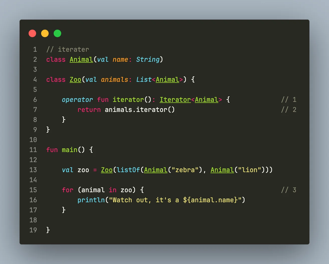 class에서 iterator를 정의해야한다. iterator라고 이름이 지어져야 하며, operator 수정자가 있어야 한다.