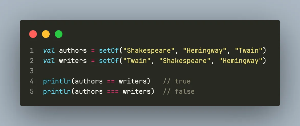 Kotlin은 구조 비교에는 == 를, 참조 비교에는 ===를 사용한다. 더 정확히 하면, a == b 는 if (a == null) b null else a.equals(b)로 컴파일 된다.