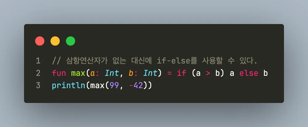 Kotlin에는 삼항 연산자(Ternary operators) condition ? then : else가 없습니다. 대신 if를 표현식으로 사용할 수 있습니다.